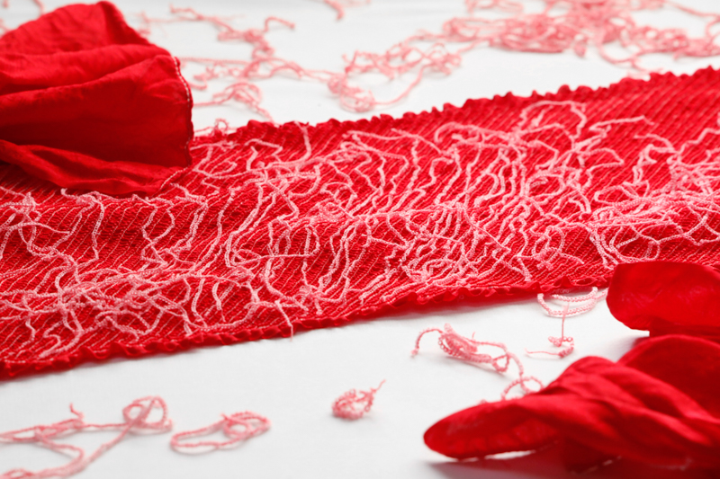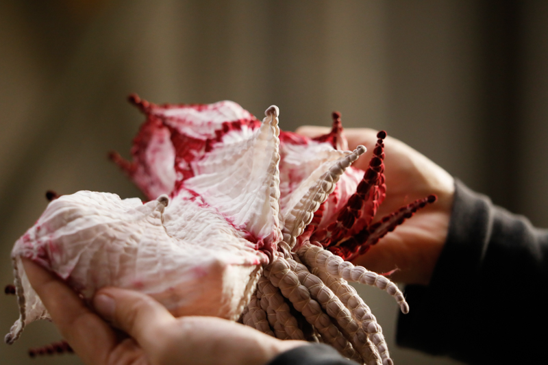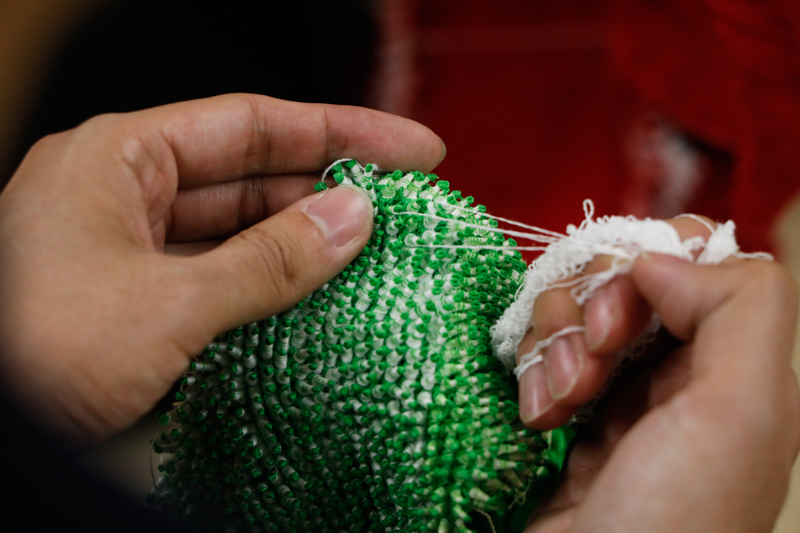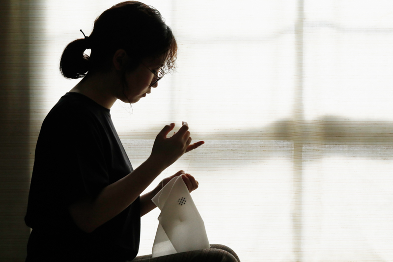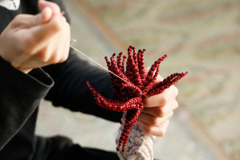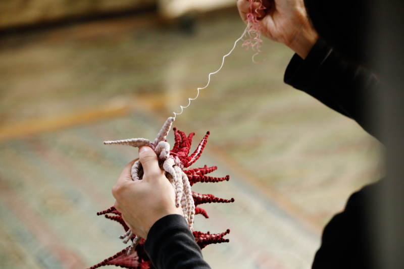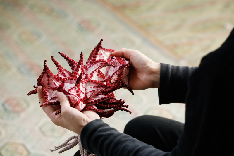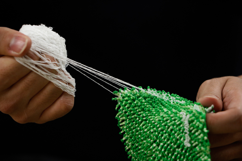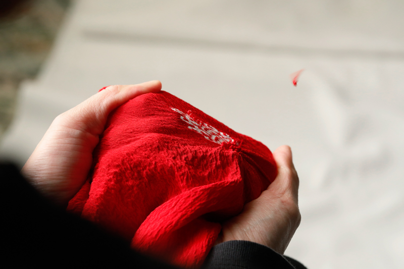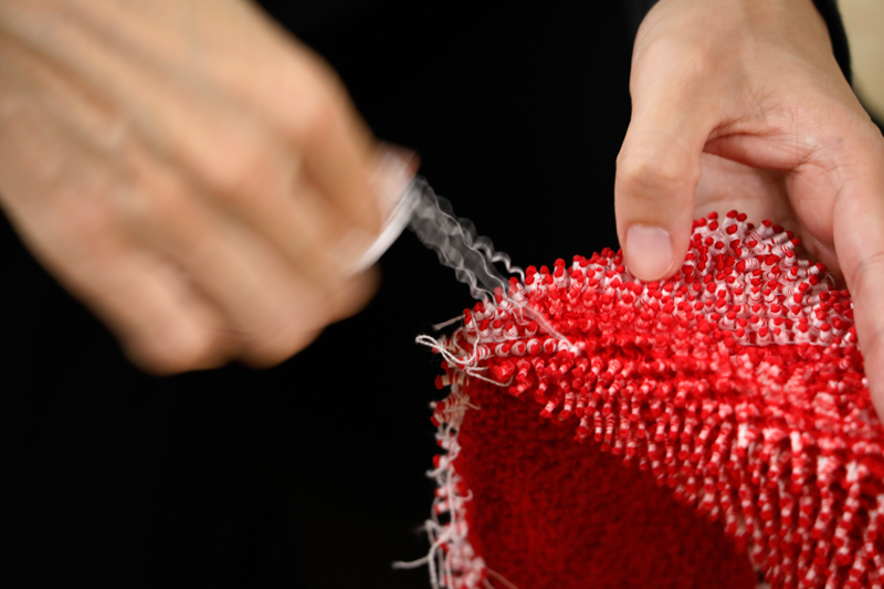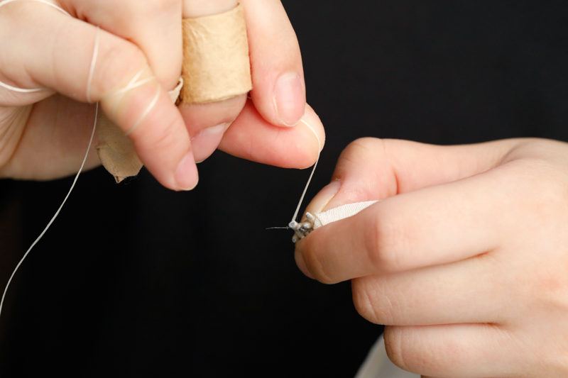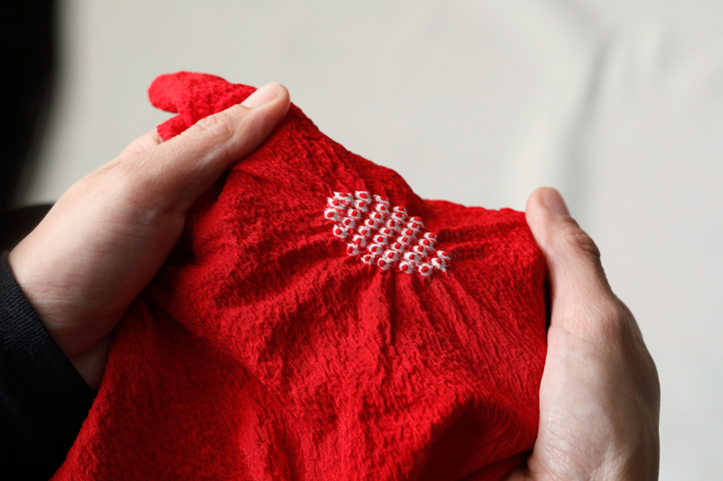 絞りと染めを終えた生地を乾燥させたのち、生地に対してくくった糸を手で一つひとつほどきます。ほどき上がると、糸で縛っていた部分は染まらず模様となり、独特の立体感が生まれます。
