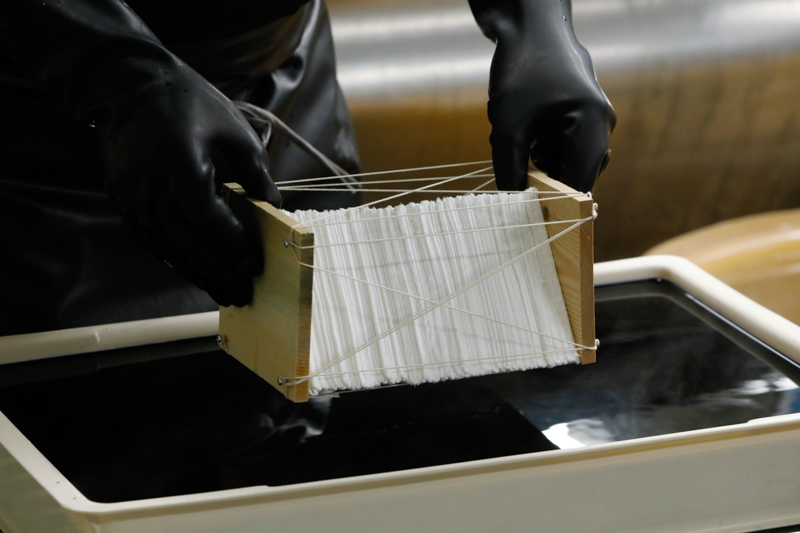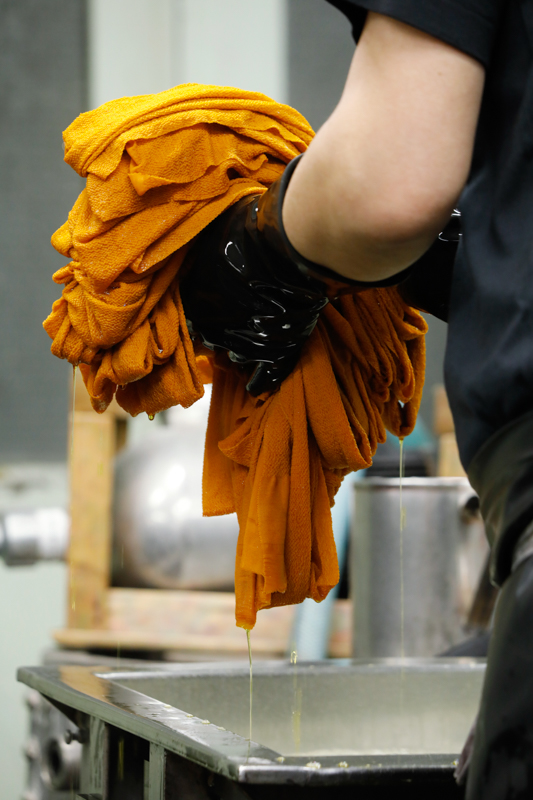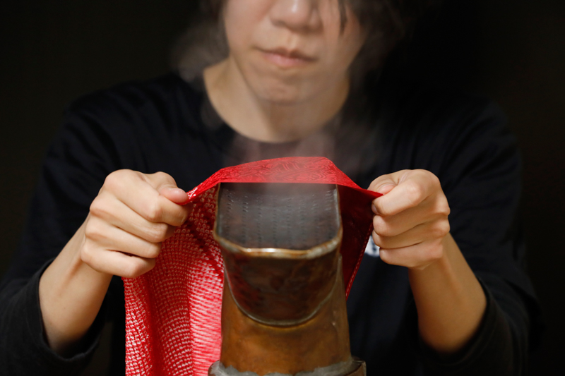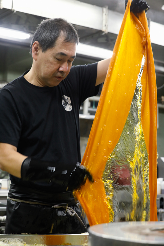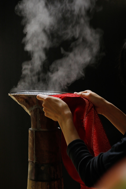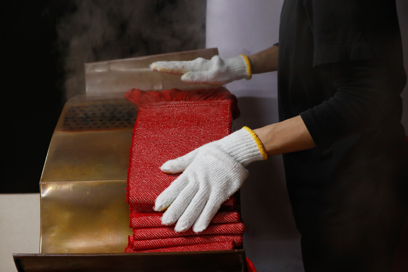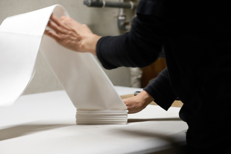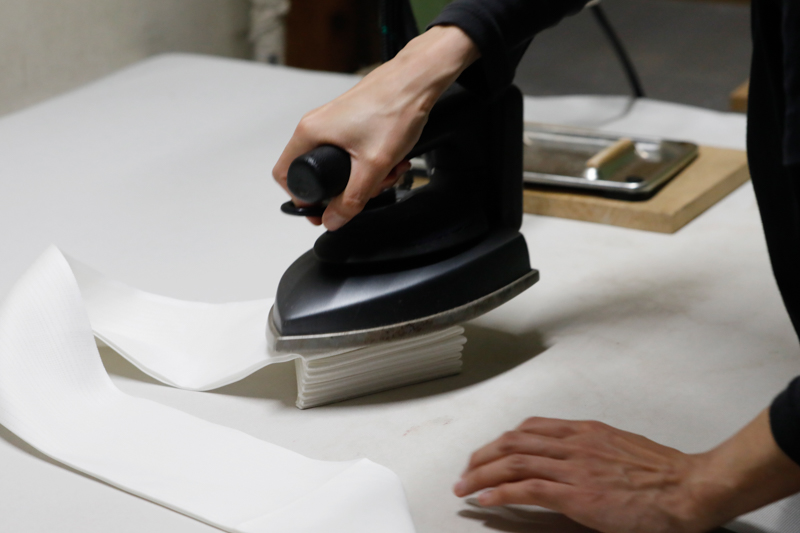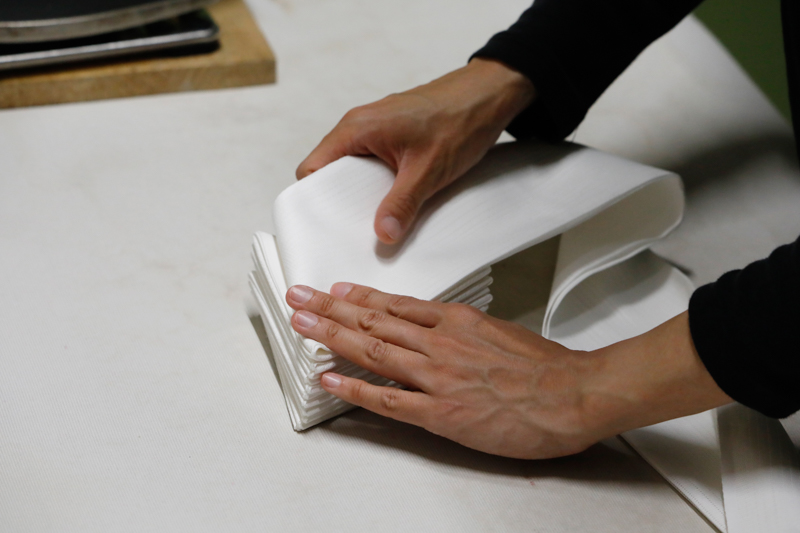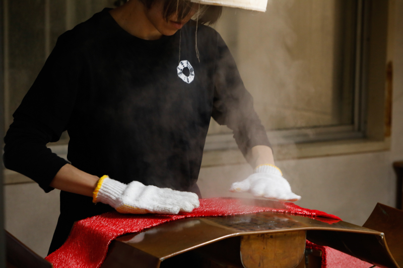 生地に蒸気を当て経(たて)糸と緯(よこ)糸をととのえることで、幅や立体感を調整することを「湯のし」と言います。目視で絞りを確認しながら、職人による手作業により1つひとつ丁寧に仕上げられます。手先(生地の端部分) は湯のしにより、生地のハリや艶が出ます。