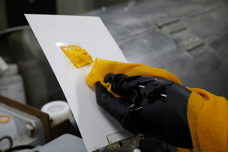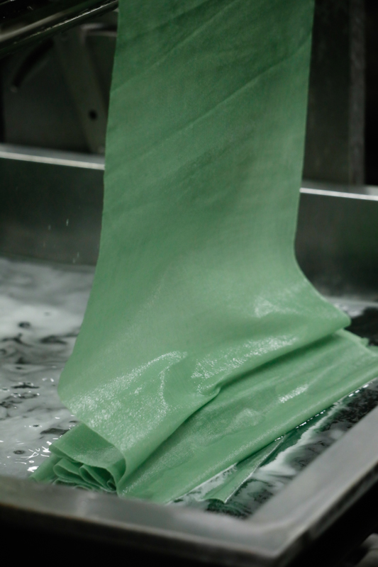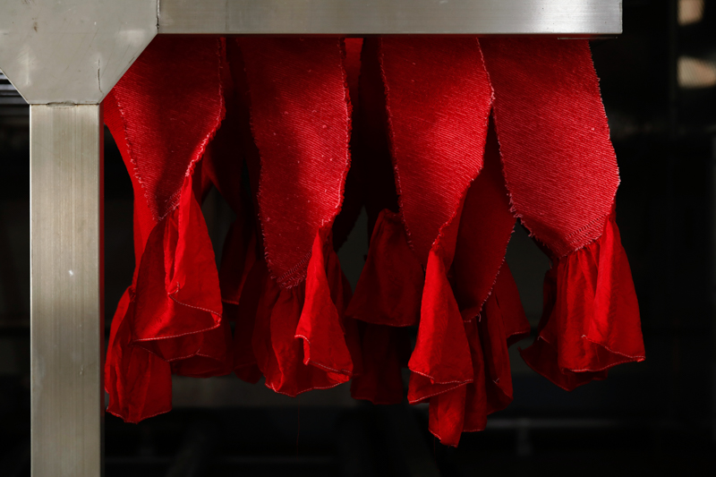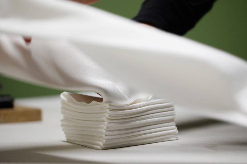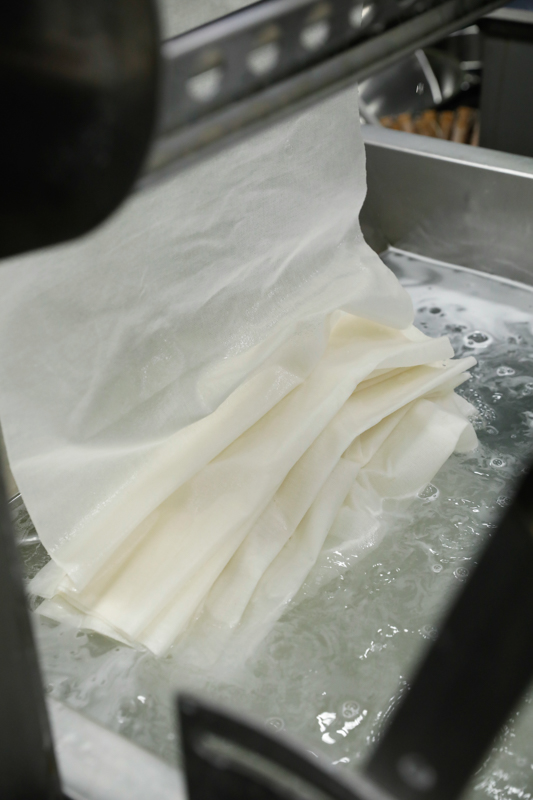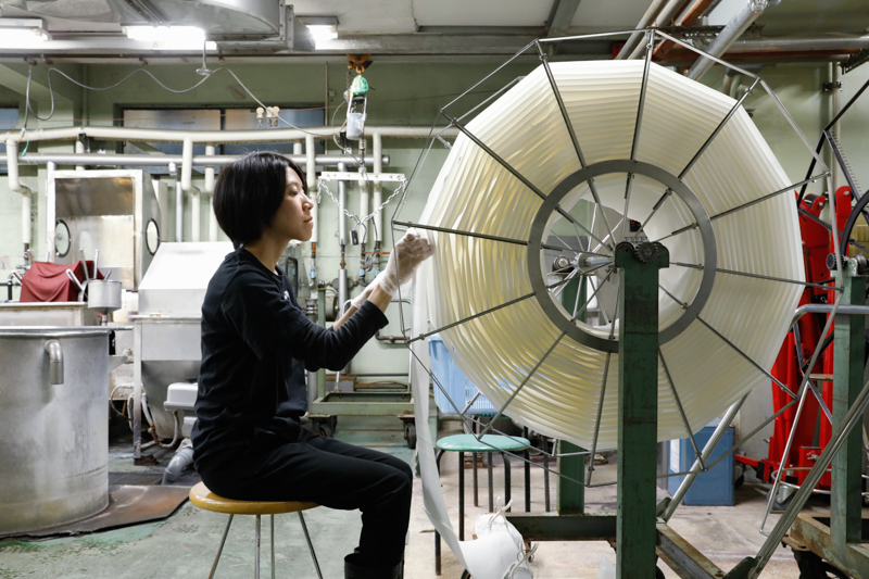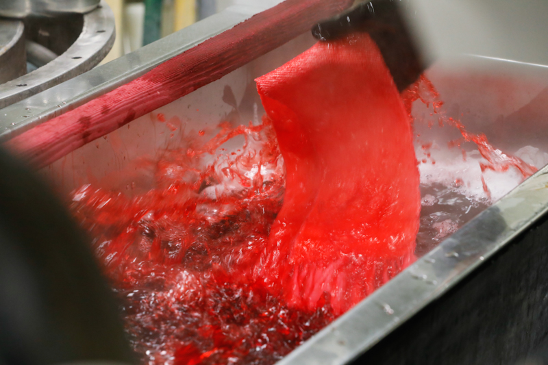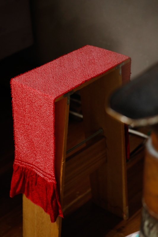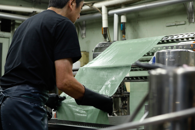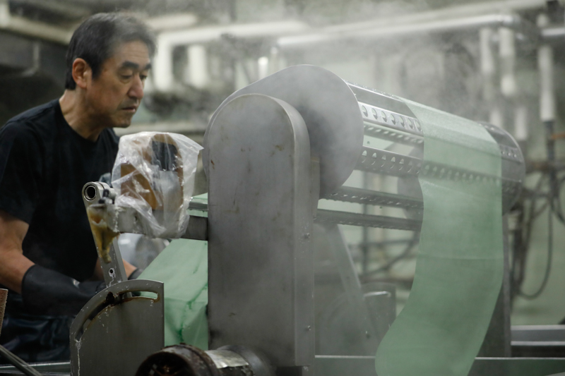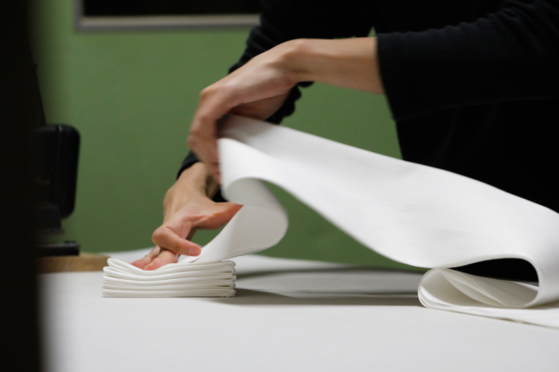 生地に蒸気を当て経(たて)糸と緯(よこ)糸をととのえることで、幅や立体感を調整することを「湯のし」と言います。目視で絞りを確認しながら、職人による手作業により1つひとつ丁寧に仕上げられます。手先(生地の端部分) は湯のしにより、生地のハリや艶が出ます。