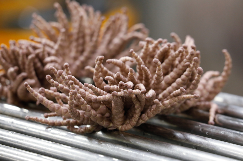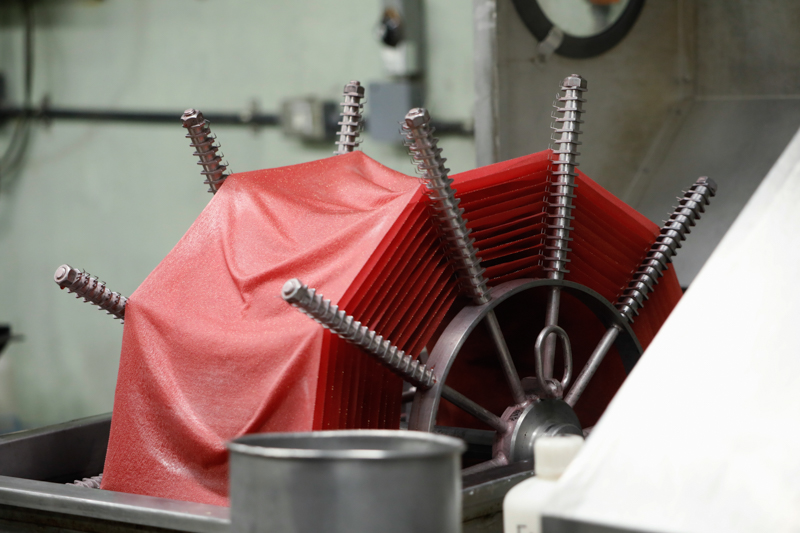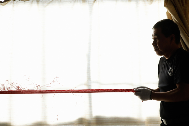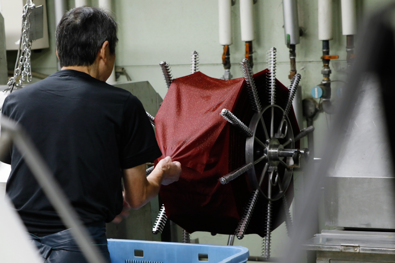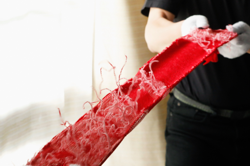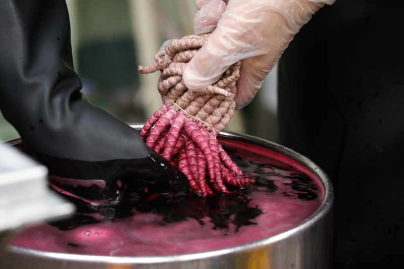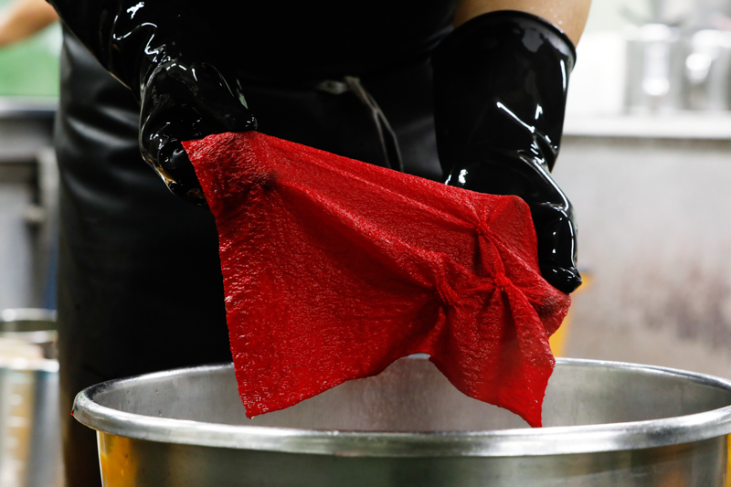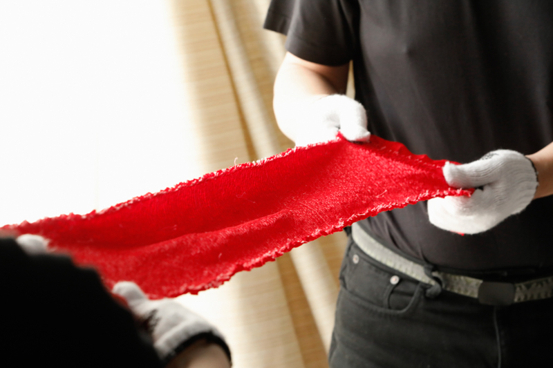 絞りと染めを終えた生地を乾燥させたのち、両端を2人がかりでひっぱり、くくった糸をほどきます。絞り部分が伸びないように指先ではなく関節部分で生地をつまんでひっぱり糸をほどくと、シボ(絞りによる細かい凹凸)が残ります。