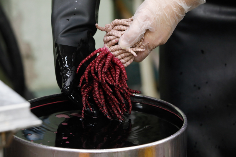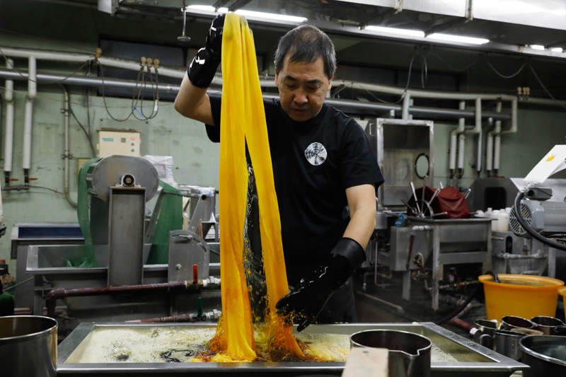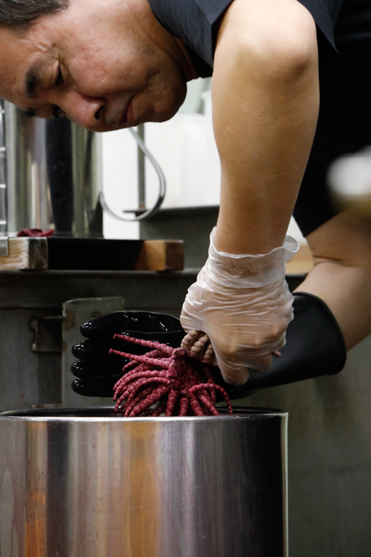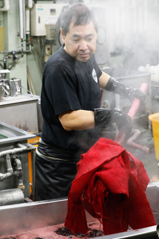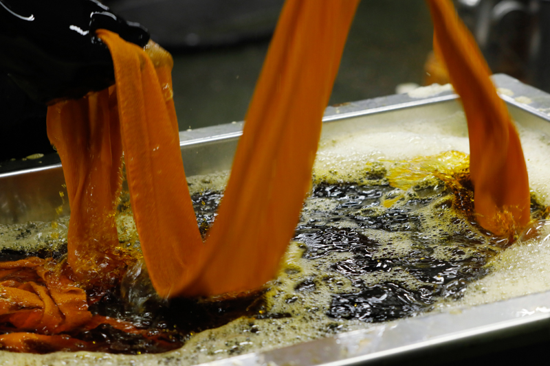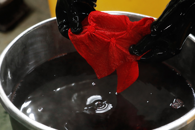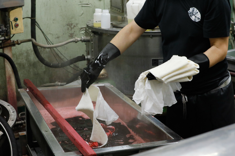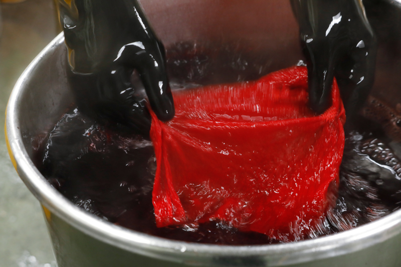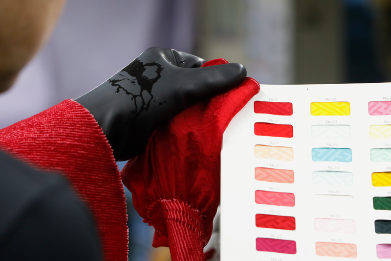 職人が目視し微調整しながら、ムラにならないよう均一になるように絹や綿や麻などの天然繊維は、同じ素材であっても その都度染まり方が異なる場合があり、丁寧に染めていきま す。複雑な色は手染めをすることで、完成度を高めます。