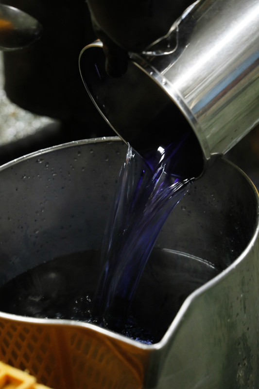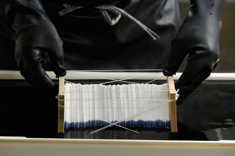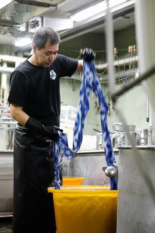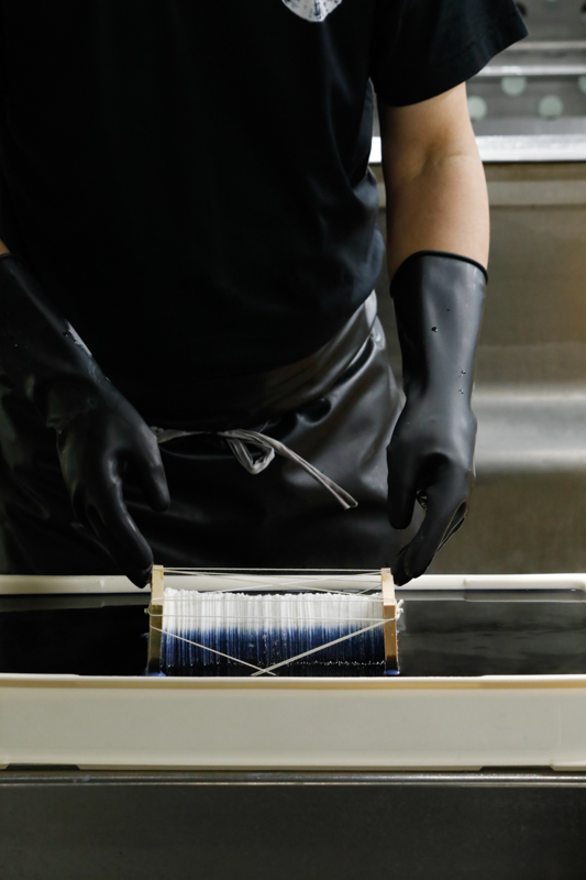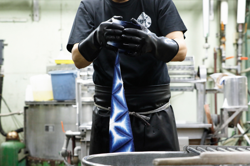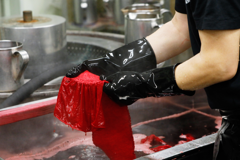 染料の液に手で生地をひたす「浸染」という染め方で、色の染まり具合を職人が手作業で細かく調整します。絞りや生地の一つひとつの風合いや特性を生かすことで、染めならではの絶妙な色合いが生まれます。
