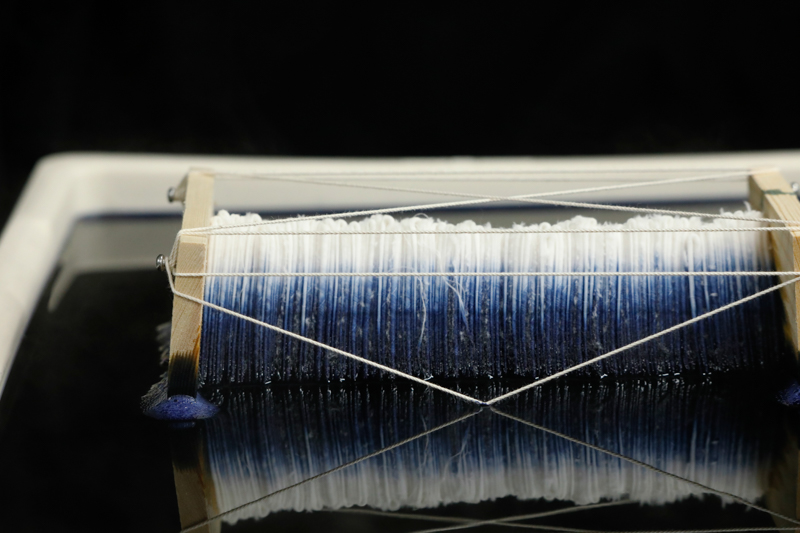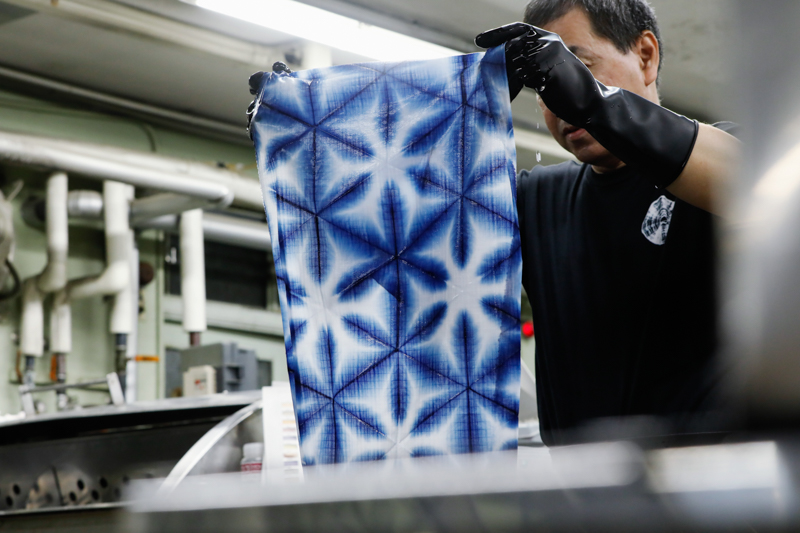 板ではさんだ生地を、浅い染料の液に浸し染色すると、自然に染料が吸い上がり、折り目に沿って規則的な模様が染め上がります。温度や湿度によって染料の吸い上がり具合が 変わるので、職人が手作業で調整し、柄の出し方をコントロールします。そうして色の濃淡やぼかしが生まれ、繊細なグラデーションが出来上がります。