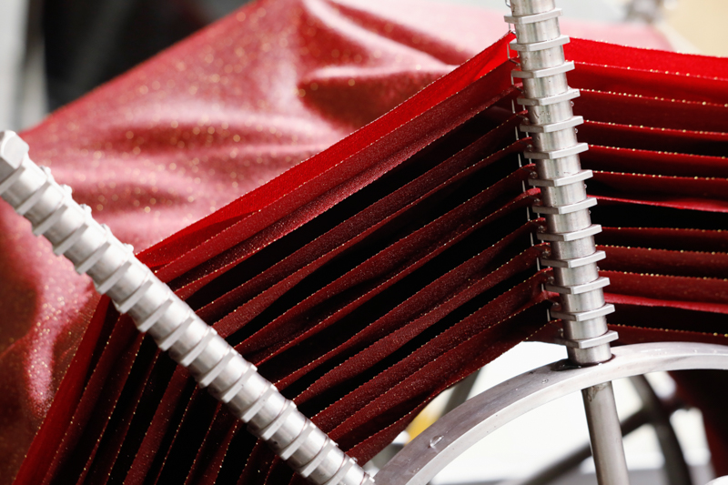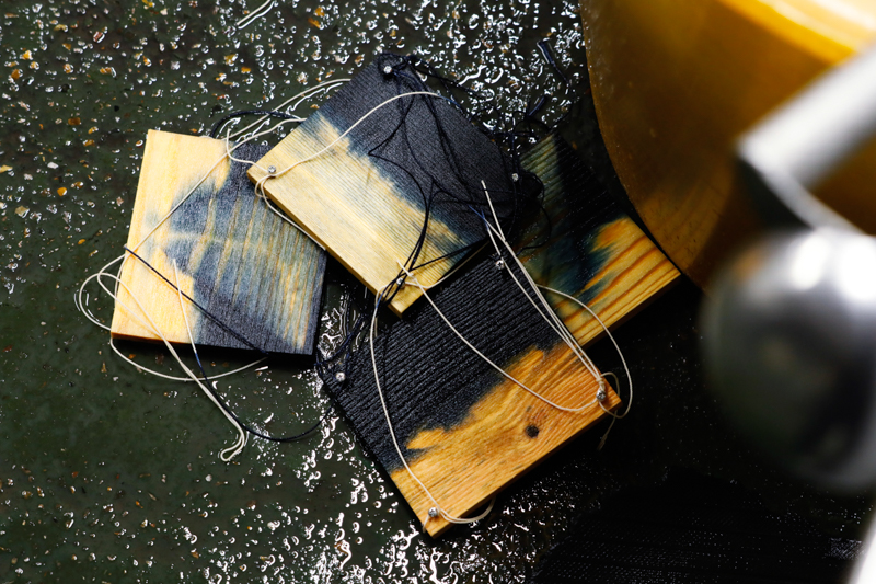 生地を幾何学的に折り畳み、板ではさんで防染する染色技法。染め上がりは左右対象の模様が現れ、折りたたみ方や染料にひたす時間を調整するなどして、さまざまな模様を作り上げます。
