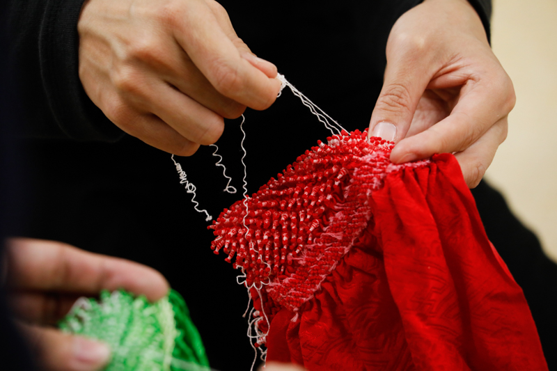 京都本社の工房で伝統工芸士や職人たちが、「染め」「絞り」「解(ほど)き」といった伝統的な技法を用いて1点1点丹精をこめたものづくりをすることで、繊細で表情豊かな作品が仕立て上がります。