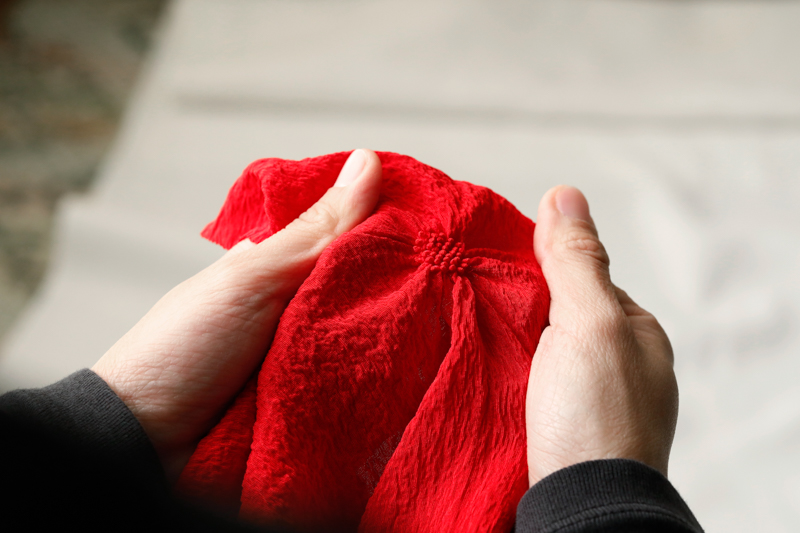 京鹿の子絞の中の代表的な技法で、生地を指でつまみ根元を 絹糸で絞ったのちに染めることで柄が生まれます。撚りがかかっていない絹糸でくくることで強く巻き締めることができ、くくられた白い部分と染まった部分のコントラストがあざやかに浮かび上がります。
