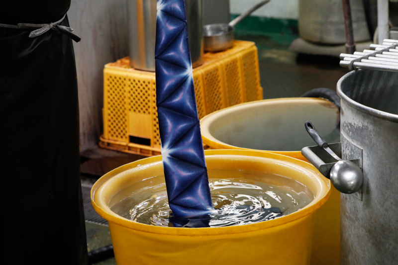 染めが終わった折られた状態の生地を濡れたままほどいて広げながら、生地を水で洗います。ほどく際に手をくるくると回すことで生地がねじれることなく綺麗に広げることができ、ほどいていくと、美しい規則的な模様が現れます。